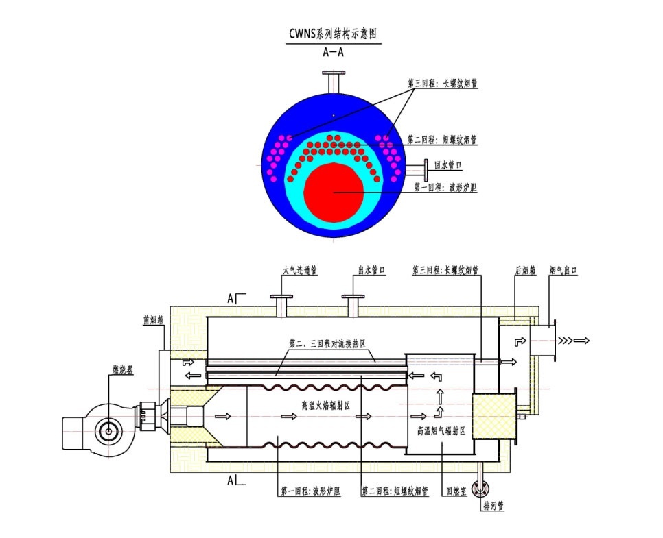 CWNS系列全自動燃油(氣)臥式熱水鍋爐(實用新型專利),采用臥式三回程濕背結構,改善鍋爐運行環境,提高鍋爐效率和使用壽命;全部煙氣通道置于水中,尾部配有余熱水箱及完善的保溫外包設計,煙箱密封采用迷宮式結構,避免了煙箱漏煙現象。